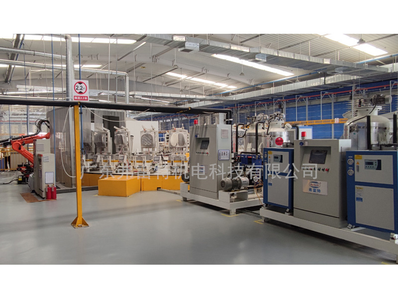 生產線需二人就可完成,產量高、速度快。生產線主要配備:上位工控機、掃碼讀碼系統、全自動模具模架、機器人、可變比例發泡機、預混站、真空破泡機等,各個設備由系統連接,具有自動糾正、報警等功能。