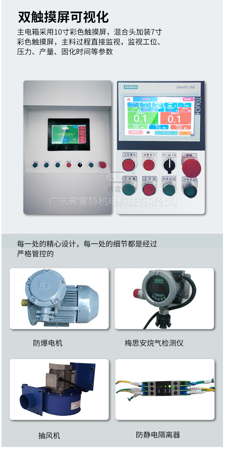 5、雙混合頭設(shè)計(jì):流量大小可調(diào)節(jié);可以往不同的地方注料,方便移動(dòng)。