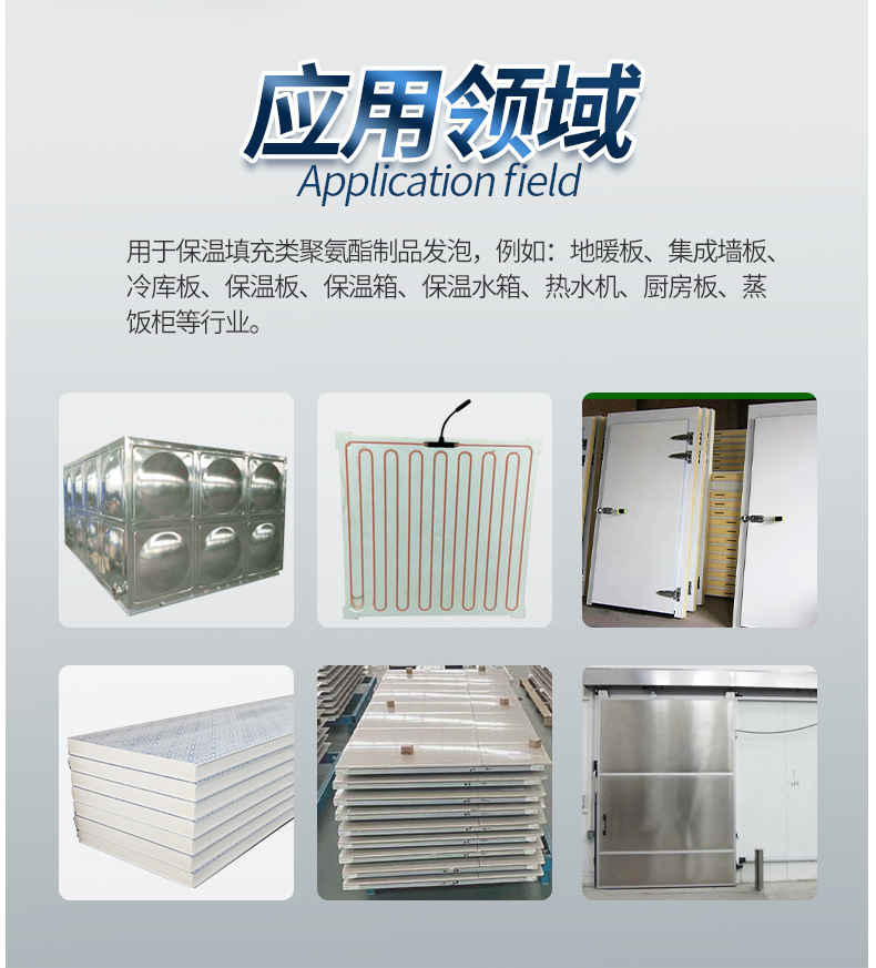 用于保溫填充類聚氨酯制品發泡,例如:地暖板、集成墻板、冷庫板、保溫板、保溫箱、保溫水箱、熱水器、廚房板、蒸飯柜等行業。
