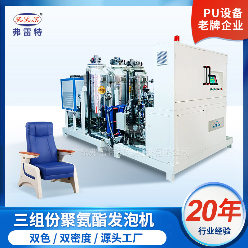 組份、多組份聚氨酯高壓發泡機是將多種不同配方的生產工藝通過設備的配置及程序設定融合到一臺機器去完成,例如:三組份聚氨酯高壓發泡機的設定條件是B+A1或A2,當工藝要求是B+A2時,系統將自動轉換成設定的要求B+A2進行灌注多組份的設定條件是 B1+ A1---B2+A2---B3+ A3最多6組份3種配方。