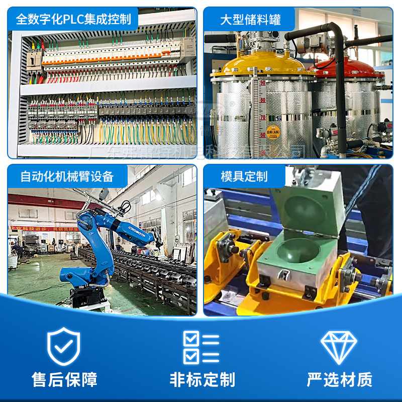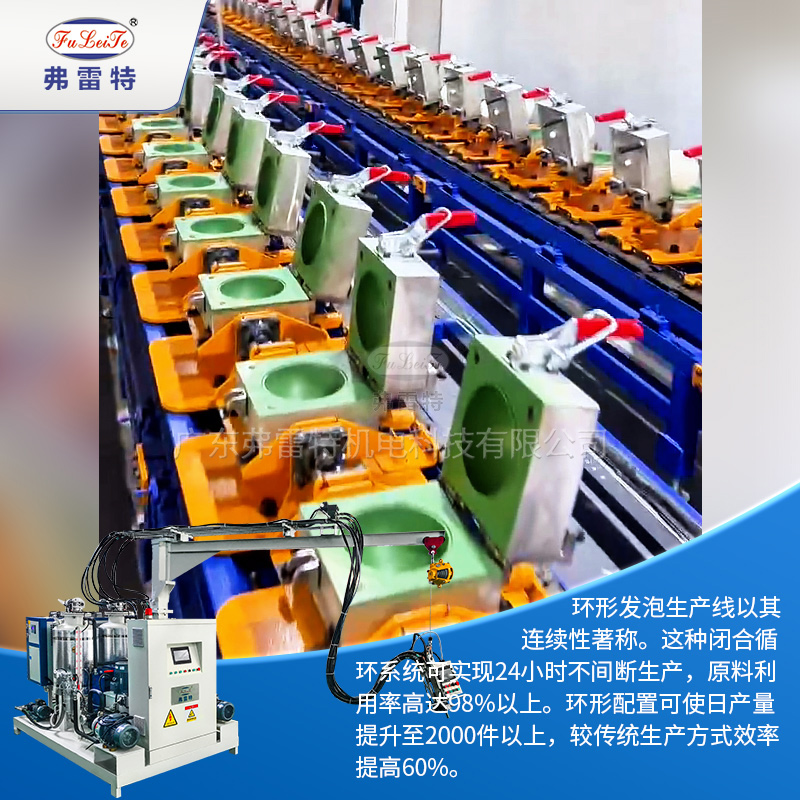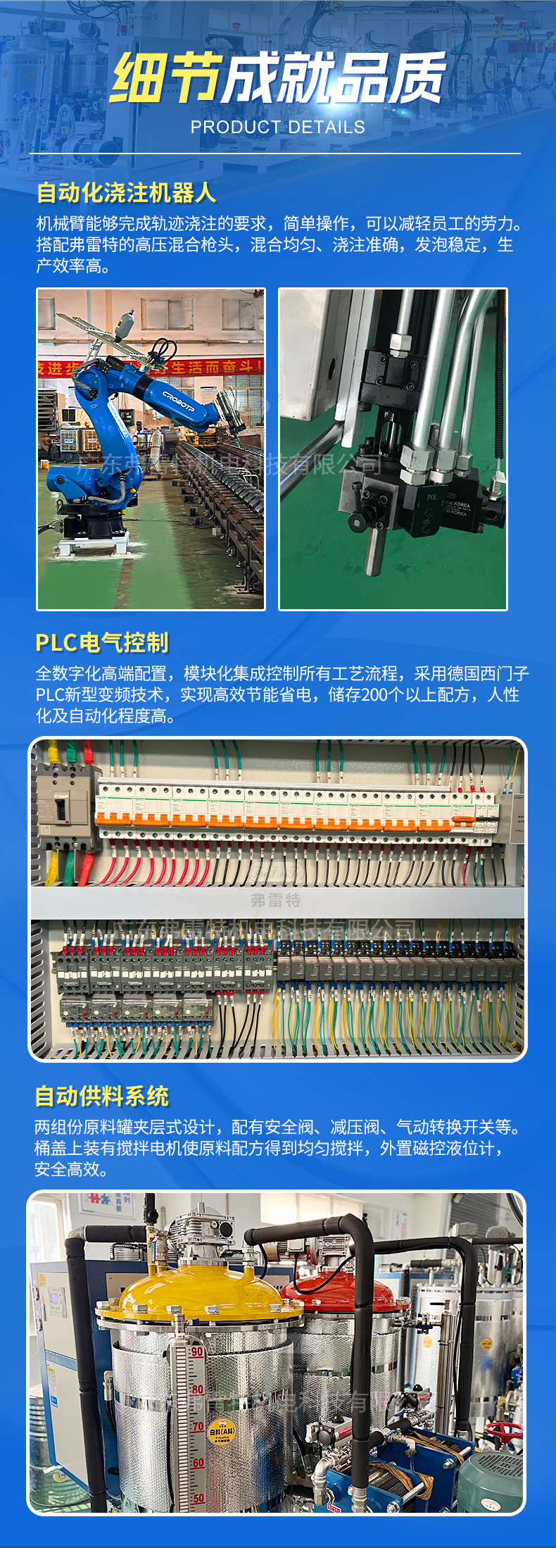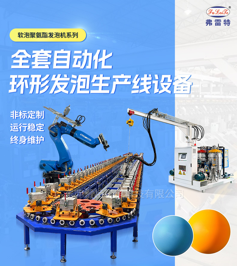 這是一套集成了軟泡聚氨酯高壓發(fā)泡機、六軸聯(lián)動灌注機器人和73米長140個工位的自動化環(huán)形發(fā)泡生產(chǎn)線發(fā)泡設備。140個模具工位晝夜流轉,核心發(fā)泡環(huán)節(jié)實現(xiàn)全程自動化,人機協(xié)同使日均產(chǎn)能突破3000件,同時將產(chǎn)品合格率穩(wěn)定在99.2%以上。弗雷特環(huán)形產(chǎn)線用科技賦能人力,用經(jīng)驗優(yōu)化算法。廣東弗雷特是一家國家級高新技術企業(yè),科技中小型企業(yè),創(chuàng)新型企業(yè)和專精特新企業(yè)。軟泡聚氨酯高壓發(fā)泡機參數(shù):