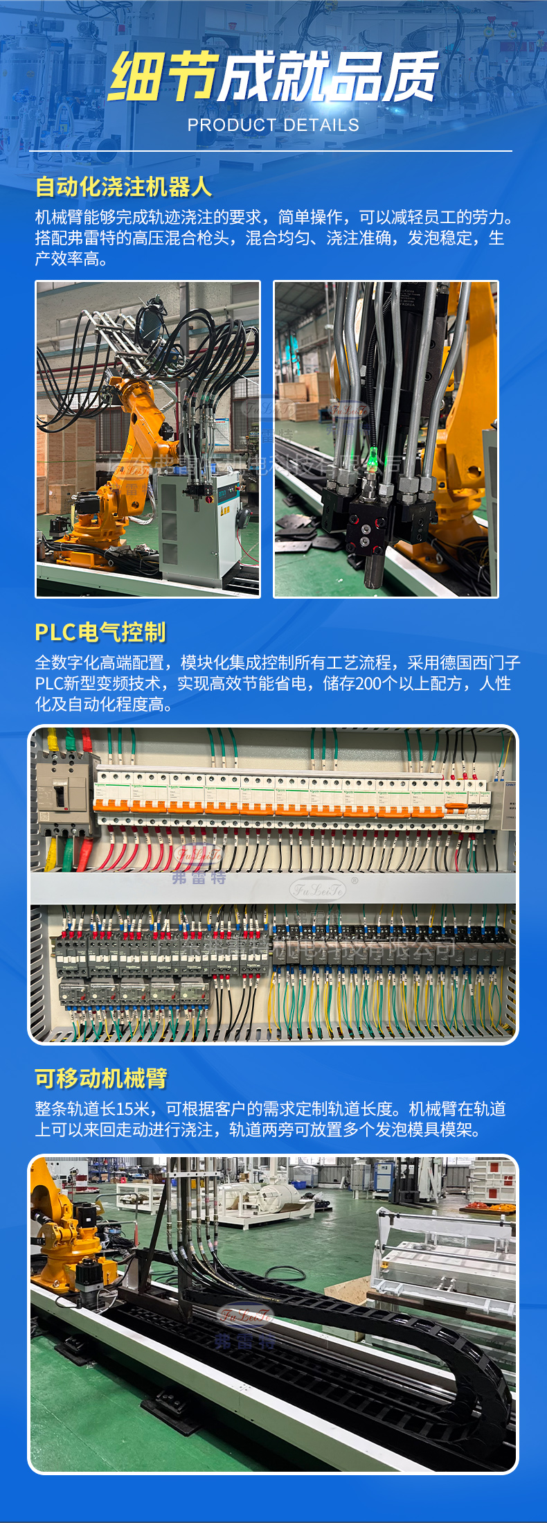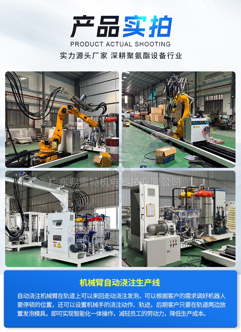 自動澆注機械臂在軌道上可以來回走動澆注發泡,可以根據客戶的需求調好機器人要停頓的位置,還可以設置機械手的澆注動作、軌跡,后期客戶只要在軌道兩邊放置發泡模具,即可實現智能化一體操作,減輕員工的勞動力,降低生產成本。弗雷特可根據客戶的需求進行個性化定制,提供全套服務,我們擁有專業的設計研發團隊、生產團隊,歡迎需要的朋友聯系我們廣東弗雷特!