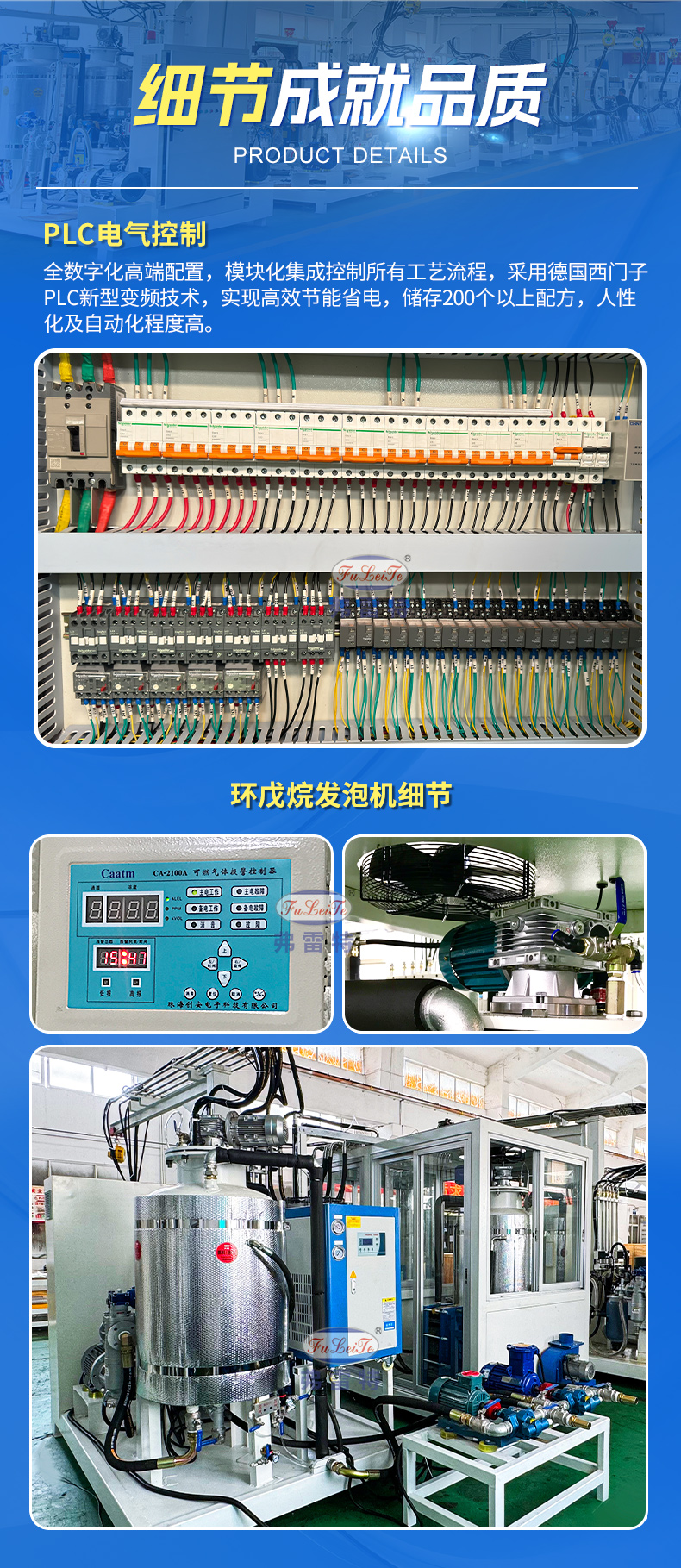 弗雷特環戊烷發泡機具有西門子PLC+雙變頻多功能安全裝置,38個智能自檢保護點,獨立防靜電房,烷氣濃度等級自動識別系統,自動2-3級抽風系統,西門子防爆電機,獨立導地裝置,槍頭引線靜電導出裝置等。