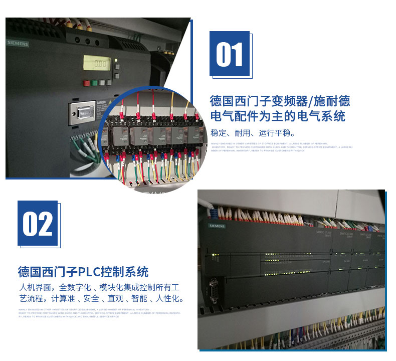 電氣控制:采用質(zhì)量可靠的配置,以西門子PLC、施耐德配件為主要基礎(chǔ)。